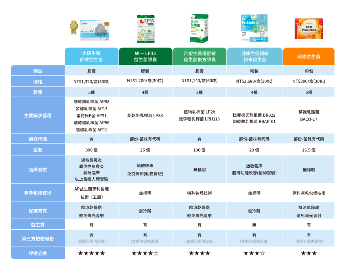 ▼以下是這五款益生菌詳細比較表格,提供給大家參考!