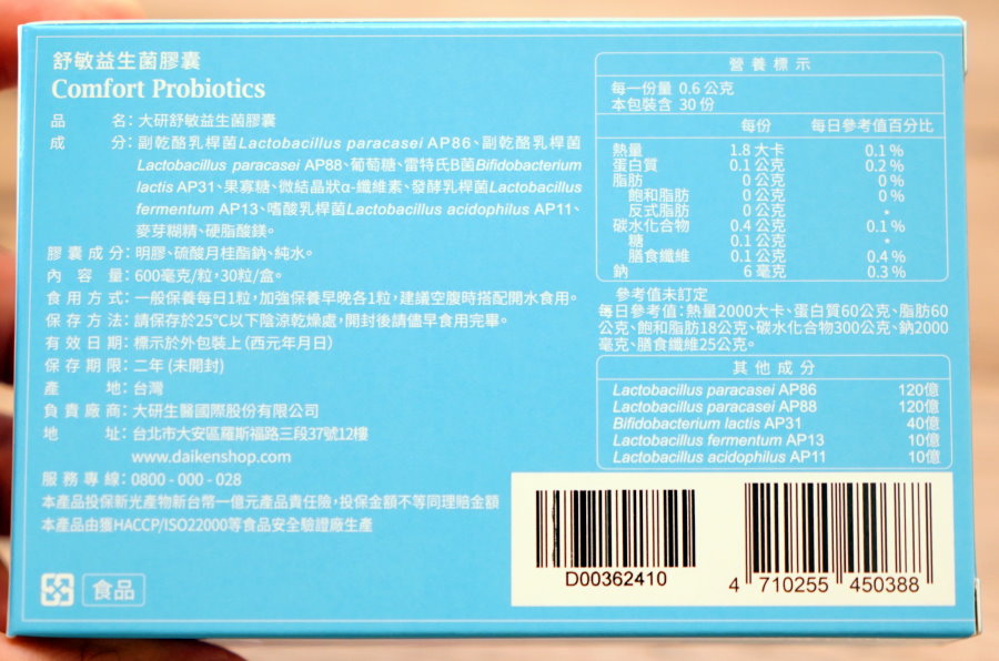 ➤大研生醫舒敏益生菌:菌數有300億之多,並榮獲全球7國專利,加上近1000人的人體臨床研究讓人更有信心;獨特的包埋技術讓益生菌更能定殖在腸道上,也沒有添加香料色素,另外在排便或是精神上都有明顯的表現,所以給予比較高的分數,不過價位偏中高,但還算可以接受。