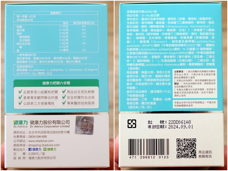 ▼盒側還有詳細的成份與營養標示,裡頭有添加優格粉及優格香料,應該是為了讓粉末狀呈現較易接受的口感~值得一提的是他們有貼上防偽貼紙,也可以掃描QR Code了解商品資訊檢驗報告,對於消費者來說也多了一層保障!