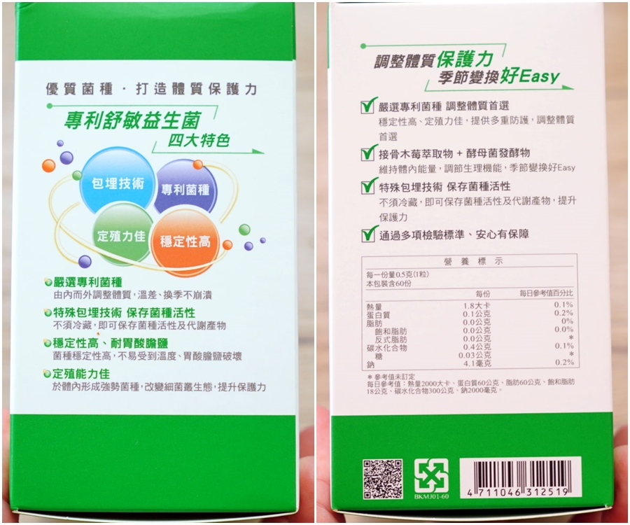 ▼盒側也有標示專力舒敏益生菌四大特色,主打調整體質,另外還有添加接骨木莓萃取物,接骨木莓富含花青素,含量為紅葡萄的10倍,還能調節生理機能,換季也不會一直包餛飩,並通過多項檢驗標準,吃起來也很安心!
