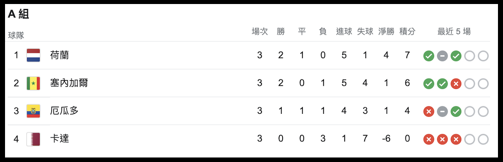 11/21 (一) 23:30 塞內加爾 0 VS 荷蘭 2