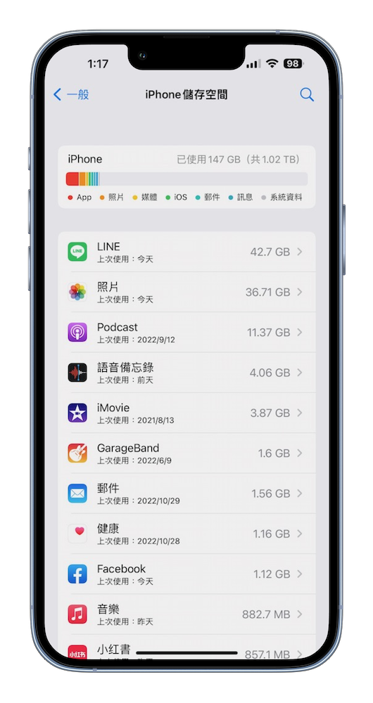 從「設定」>>>「一般」>>>「iPhone 儲存空間」,上方會顯示 iPhone 目前使用了多少容量,並將各類型所佔空間的比例用不同顏色顯示,下方還會依照所佔容量大小來將 app 們排列。 (第一次使用會先花比較多的時間計算)