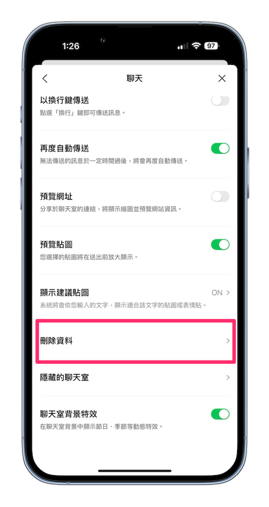 Step 1. 進入 LINE 「設定」>>>「一般」分類中的「聊天」>>> 「刪除資料」