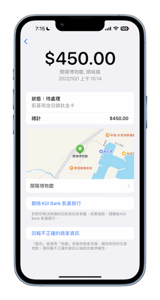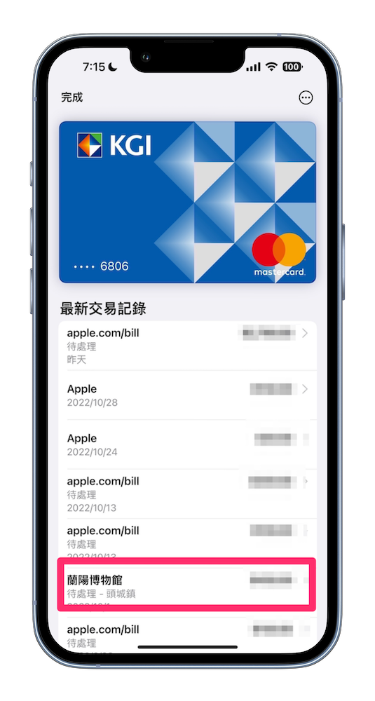 開啟「錢包」後點選想要查詢的那張信用卡,便會出現使用於 Apple Pay 的消費記錄。