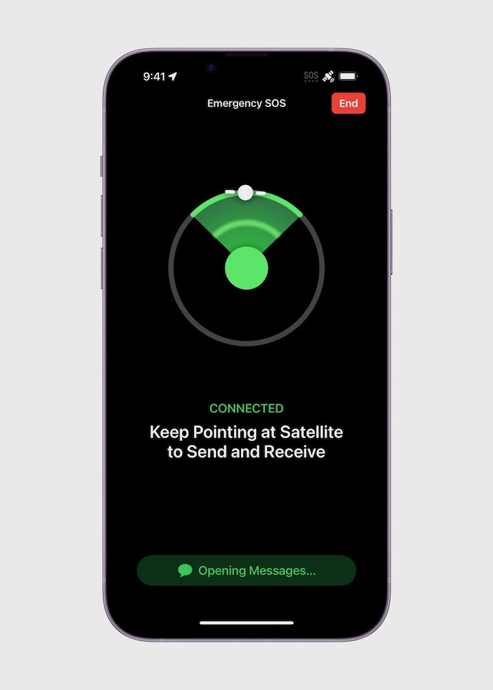 由於衛星是低頻寬的移動目標,而且在天空中不斷地移動,因此這些訊息可能需要幾分鐘時間才能傳出。配備利用衛星的「SOS緊急服務」的 iPhone 會預先載入一些像是救援對象等關鍵問題來評估使用者情況,並指示應將手機對準何處以連接到衛星。