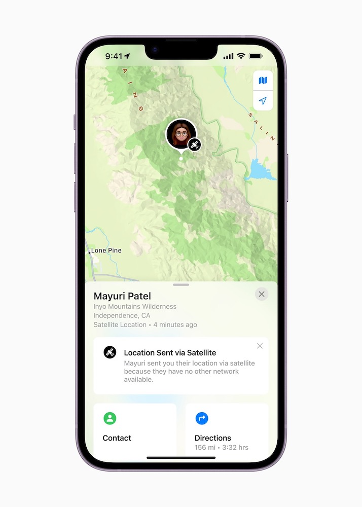 最初的調查問卷,以及後續的訊息會被轉發到中繼中心,由 Apple 訓練的專員替使用者撥打電話尋求協助。這項突破性技術也讓使用者能在沒有行動網路或 Wi-Fi 連線時,透過衛星來「尋找」功能手動分享所在位置,讓在野外健行或露營的使用者感到更安全。