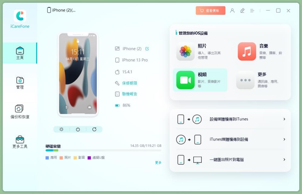 究竟有沒有一款軟體結合了 iOS 裝置資料的備份、傳輸和轉移功能?有的,Tenorshare iCareFone 恰是最優選擇!它的操作介面簡單易懂,一鍵即可將 iPhone 照片備份至電腦(可以免費體驗哦)!這款軟體也允許用戶自行選擇想要備份的資料類型,無須強迫備份整部裝置,備份速度超快。