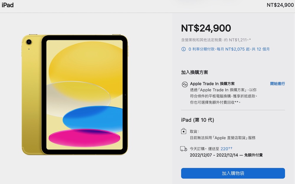 第 10 代 iPad 有著 10.9 吋 Liquid Retina 顯示器,充電孔改為 USB-C 接孔,並且支援 5G、搭載 A14 晶片,有 64GB、256GB 2 種容量選擇,WiFi + LTE 售價 NT$19,900 – NT$24,900,現在下訂最快 12 月 7 日左右可到貨。