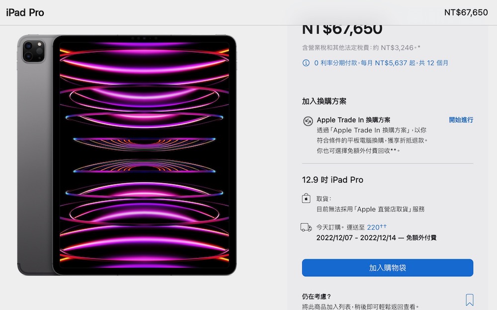 搭載 M2 晶片的 iPad Pro 有 11 吋 與 12.9 吋 2 種尺寸,新增 Apple Pencil 懸浮偵測、 Pro 相機、Face ID、Thunderbolt,以及四揚聲器音響系統,儲存容量從 128GB – 2TB ,WiFi + LTE 售價 從 $32,900 元與 $42,900 元起,頂規版售價到 71,400元 與 81,650 元,最快同樣 12 月 7 日收到。