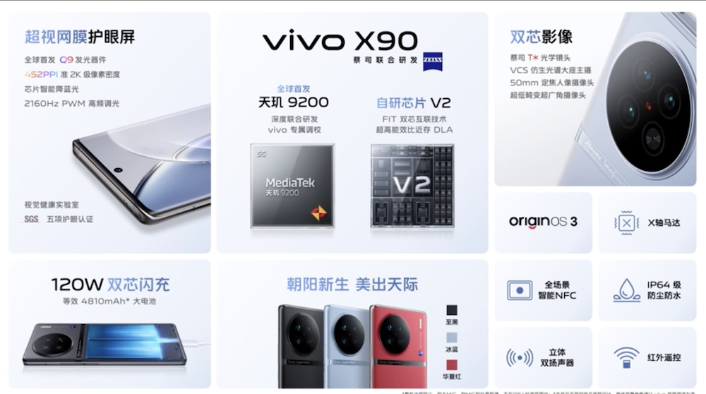 身為首款採用天璣 9200 的 X90 系列,天璣 9200 在實驗中的跑分高達 1,284,469,續航方面比 X80 系列提升 12%。vivo 也為 X90 系列加入自行研發的 V2 晶片,要與天璣 9200 一起進行雙晶片合作模式,由以往的雙晶片的串聯方式改成並聯的方式、大小腦的關係變成了左右腦的互動,讓運作上更加的迅速,並且帶來「4K 超感“夜視儀”」、「臻彩夜景錄影」與「雙晶片 Boost 電競體驗」三大特色。