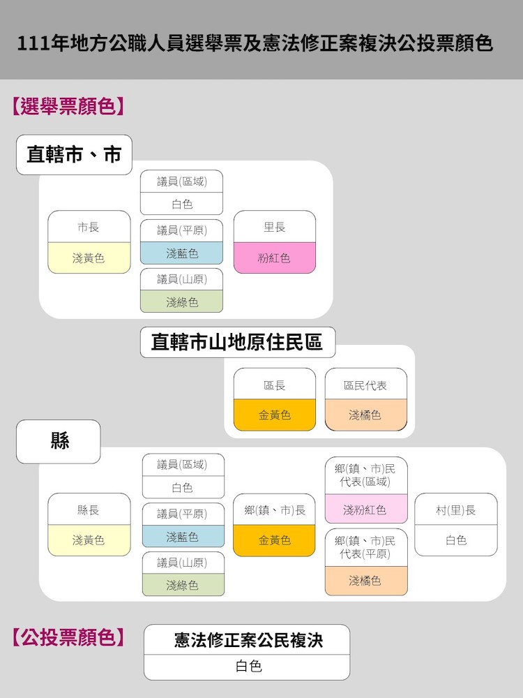 此次投票會有 2 種選票,第 1 種是市長、縣長、市議員、縣議員、里長、鄉長等地方公職人員選票、另 1 種是公投票,不同選票將以不同顏色劃分,18 歲公民權修憲複決公投選票為白色。