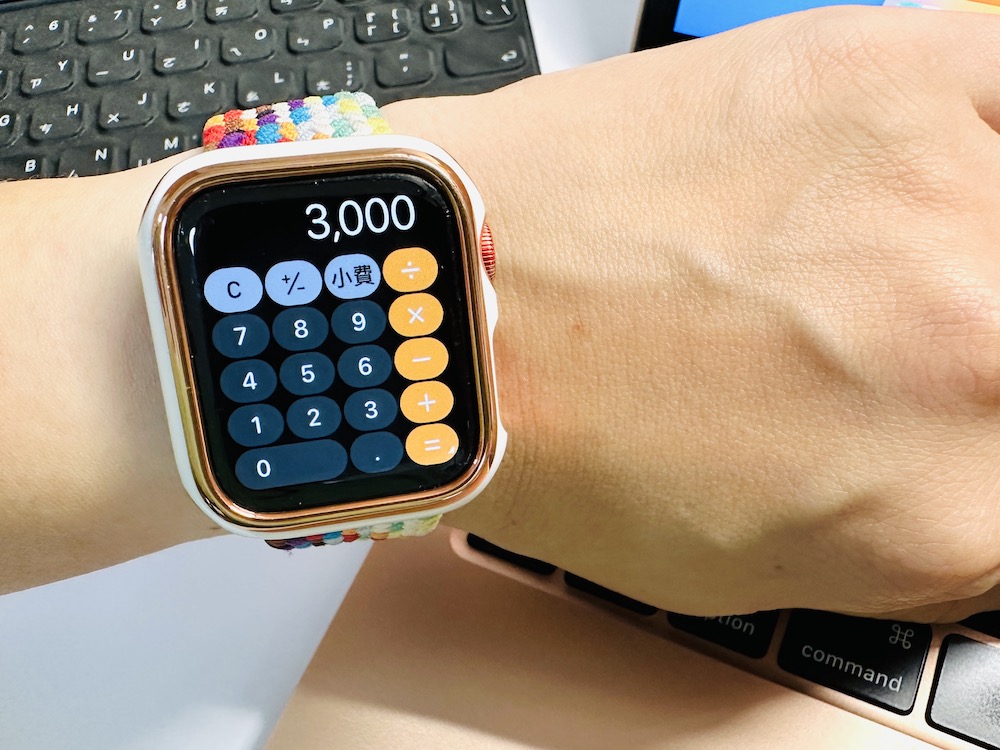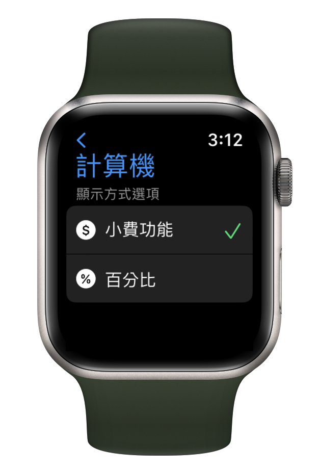 步驟 3. 回到 Apple Watch 中打開計算機,就會發現鍵盤上出現了「小費」的選項。接著在數字欄位中輸入金額數字,再藉由一側的錶冠旋轉來選擇小費的 % 數或是想要平均分攤的人數,手錶上就會相當迅速的直接算出來!