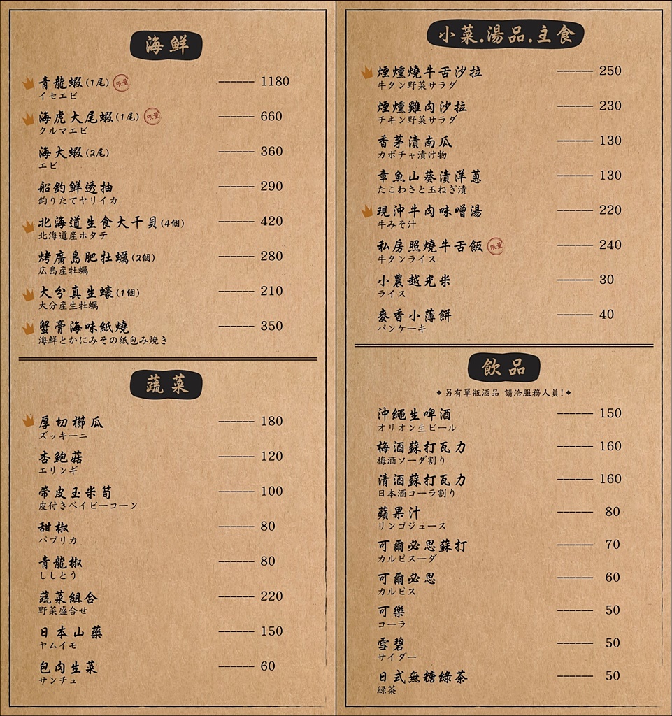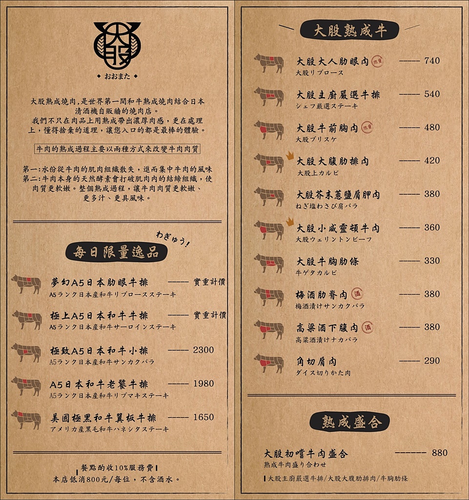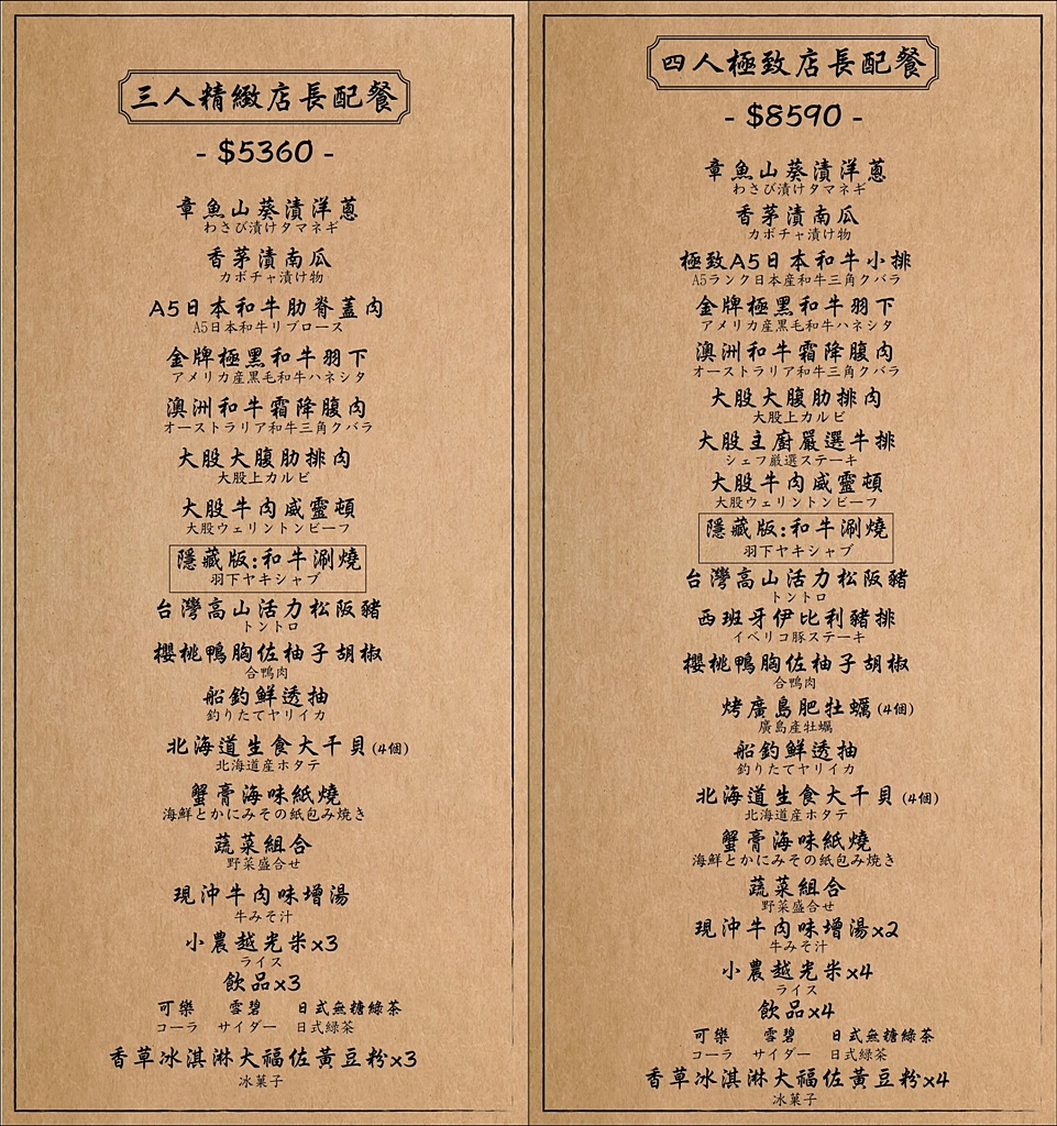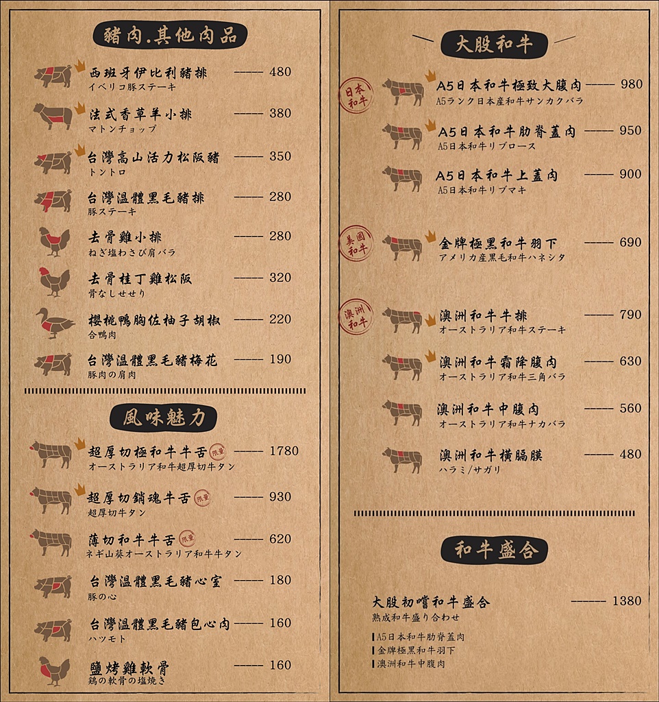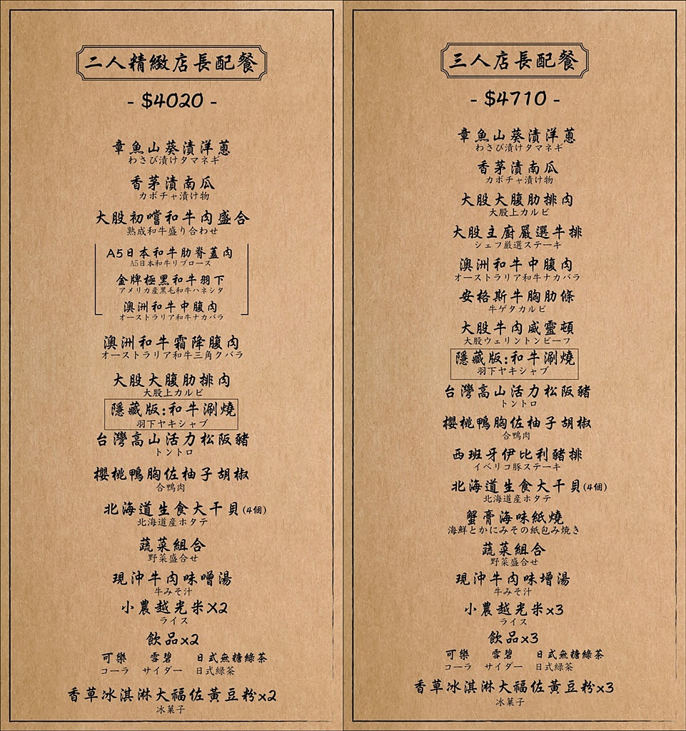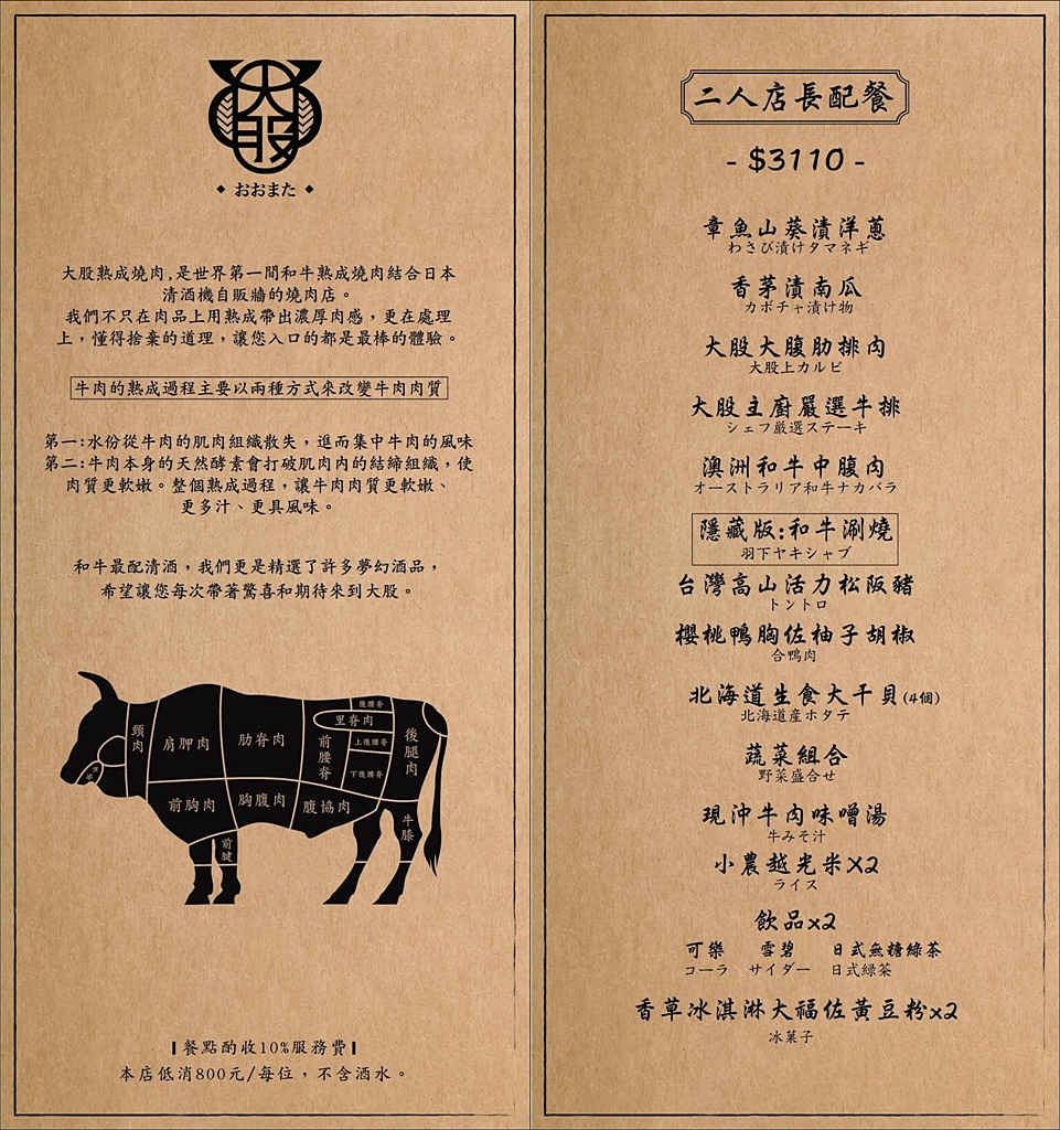 店內的牛肉均採熟成技術,經熟成過後的肉質會變得更柔軟、脂肪更均勻,另外還有提供日本及澳洲的和牛,豬肉及其他肉品,各式海鮮、小菜、湯品等,初訪不知道怎麼點才好,可以參考菜單上兩人到四人的套餐組合!