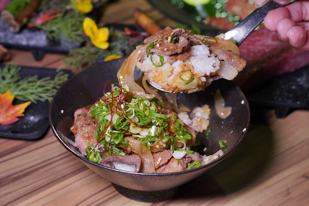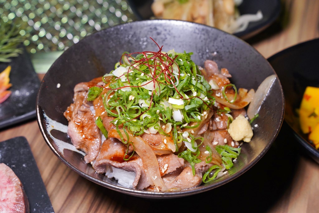 單吃燒肉沒有飽足感,也是有飯類可以選擇,這碗的牛舌就是薄片的,也是很脆嫩,搭配照燒醬跟一點點的山葵點綴,忍不住讓人一口接一口的扒飯,好夠味啊~