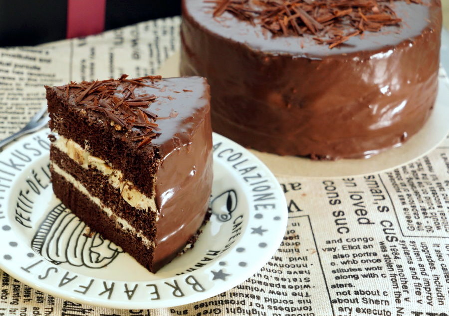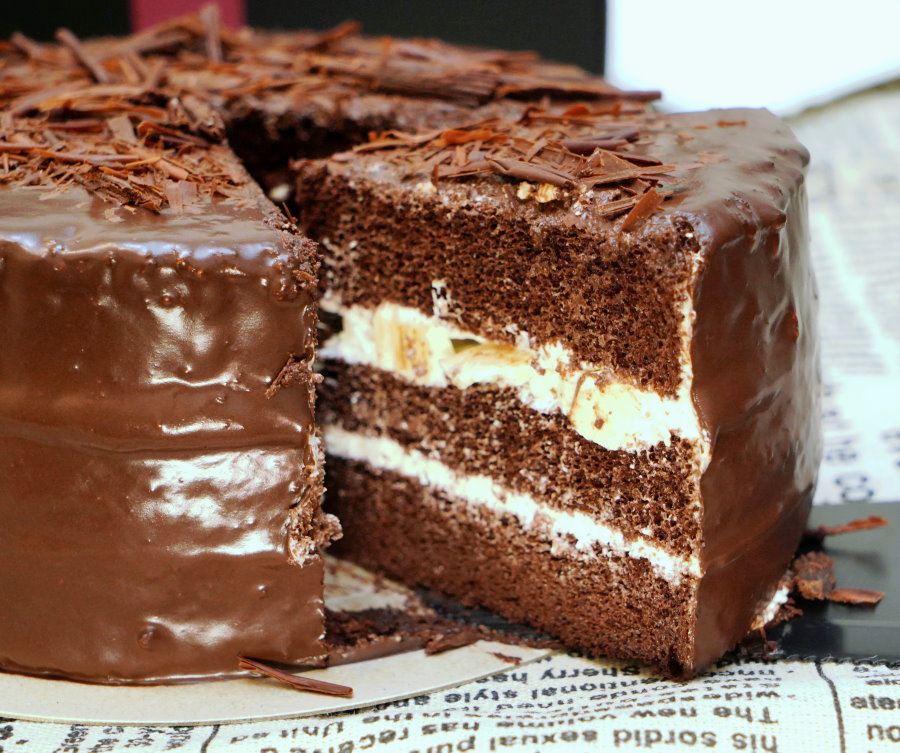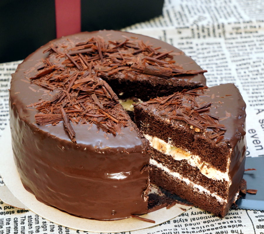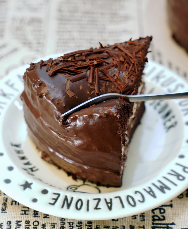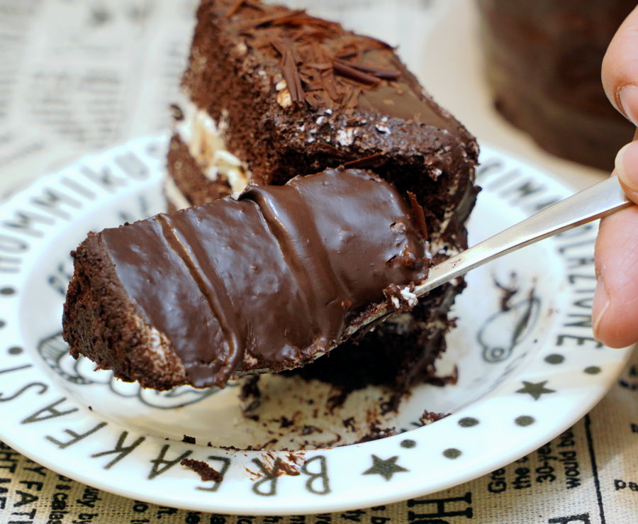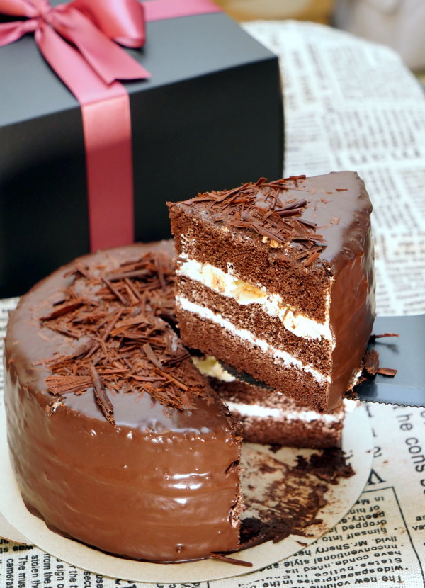 ▼切開一看,巧克力蛋糕體中間夾層是鮮奶油與奶酪餡,外頭再淋上一層厚厚的巧克力,冰過更能享受到它的美味,離開冷藏太久巧克力就會慢慢融化,口感會略有差別,雖然還是很好吃啦!