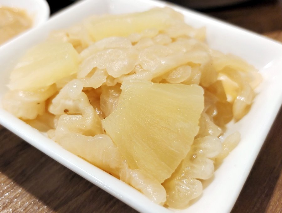 ▼紫蘇梅汁苦瓜,採用紫蘇梅搭配鳳梨醃漬,吃起來酸香甘甜很入味,表現的比另一道金沙翠苦瓜好多了!