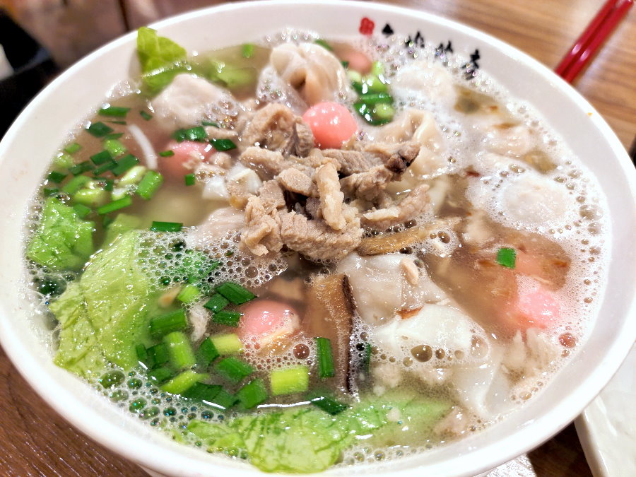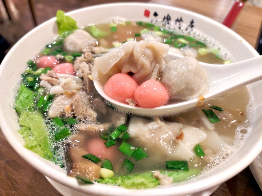 ▼客家餛飩鹹湯圓,這道料多實在,除了湯圓之外還有餛飩、肉絲、香菇、韭菜、丸子、蔬菜等配料,看起來超豐盛的!