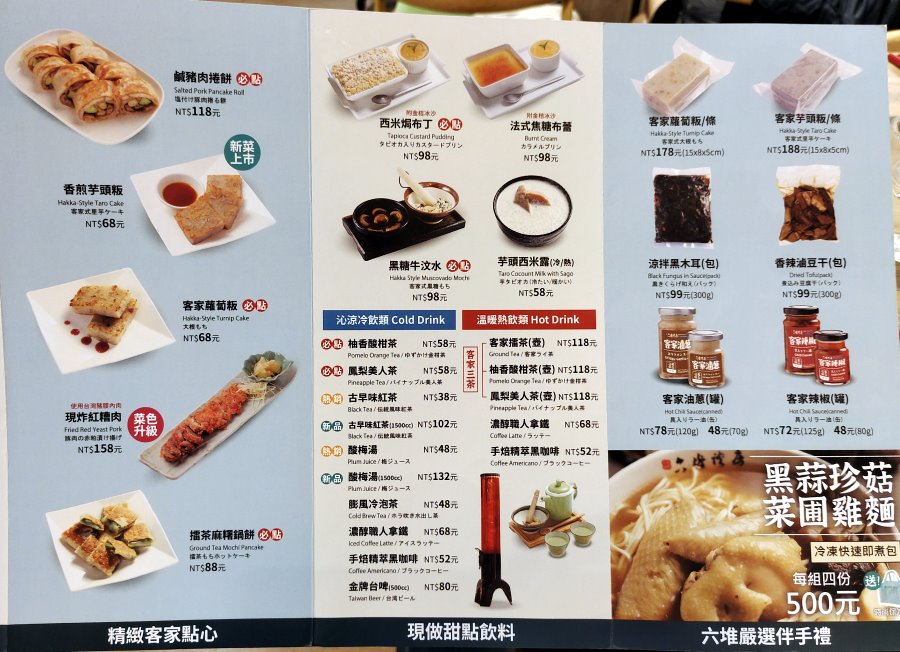▼菜單,這裡的餐點選擇還不少,有主食、湯品、湯麵、開胃菜、客家熱炒、客家點心、甜點飲料等,價格很親民,另外也有推出伴手禮,有需要的朋友也可以一併選購!這裡採用QR Code自助點餐,長輩或沒有手機的朋友也可以請服務人員來點餐唷!