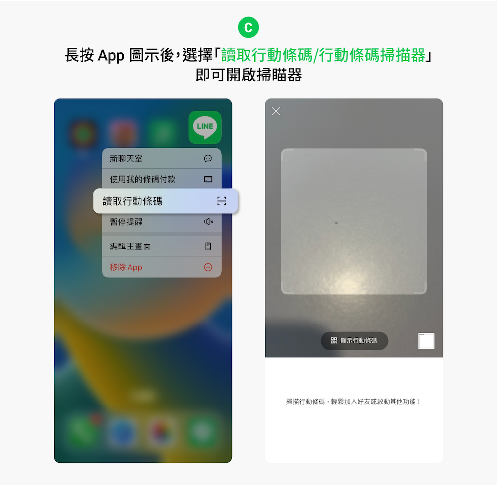 不管是要新加好友掃別人的 QR code,或是路上有人拿著條碼請你填寫表單,又或者需要使用 LINE app 支付款項時,只要長按圖示後,選擇「讀取行動條碼 or 行動條碼掃描器」即可快速開啟掃描器!