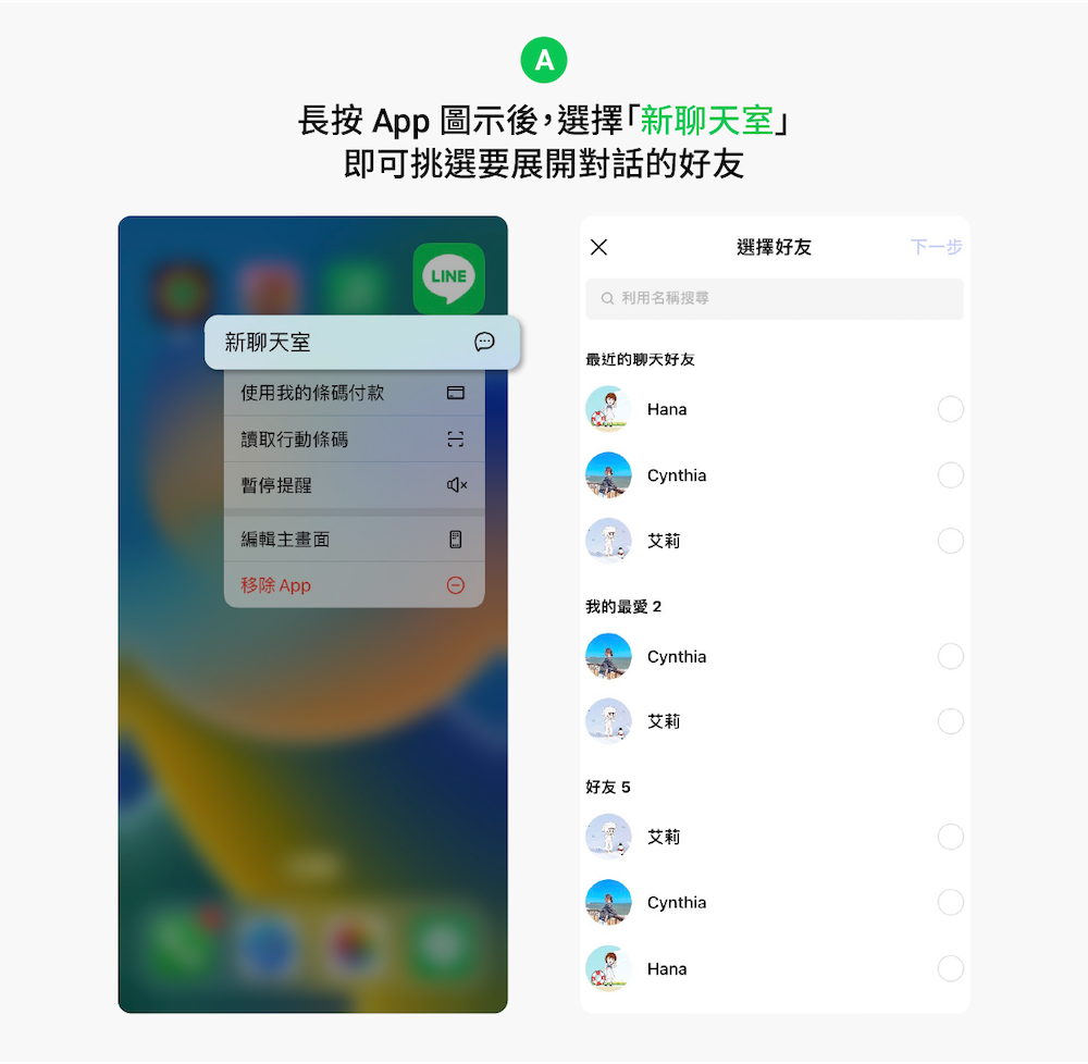 認識了新朋友,需要開啟一個新的聊天室,不用點進 app 也能做到,直接長按圖示後,選擇「新聊天室」,就可以挑選自己想要開始對話的朋友。