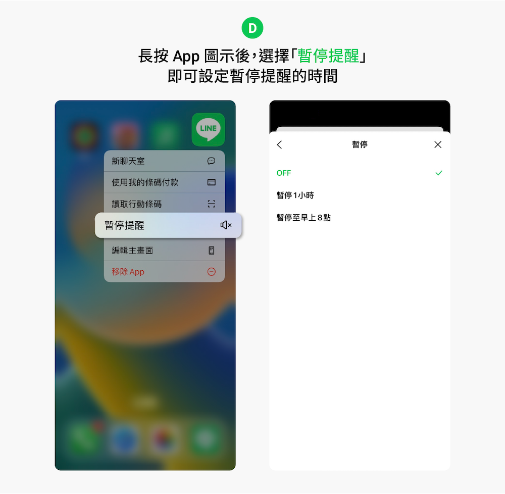 你有紅點強迫症嗎?當在忙碌或是開會時,很希望營造一個沒有通知紛擾的沈浸式空間嗎?只要長按圖示後,選擇「暫停提醒」即可設定暫停提醒的時間區段。