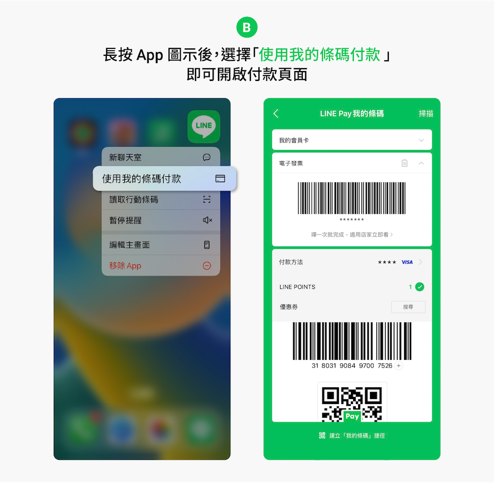 每次結帳要使用條碼付款,總是要手忙腳亂的經過層層關卡,才能開啟支付條碼嗎? 其實只要長按圖示後,選擇「使用我的條碼付款」,就可以秒開啟支付條碼,再也不用對後面排隊的長長人龍,感到壓力山大了。