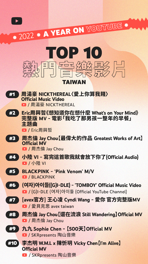 出創作者的取材隨著疫情趨緩而更多樣化,結合時事話題、娛樂綜藝等主題,深受觀眾喜愛;而眾多創作歌手們的熱門單曲也上榜音樂影片排行,在 YouTube 上嶄露頭角。今年,爆笑無厘頭的《算命阿姨 九天玄女》勇奪「熱門影片」冠軍;而「熱門音樂影片」則以周湯豪親自執導 MV 的《愛上你算我賤》登上第一。