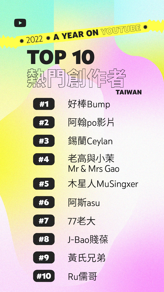 熱門創作者榜單反映了觀眾的多元喜好,類型橫跨科普時事、醫療健康與休閒娛樂,而百萬創作者:「老高與小茉 Mr & Mrs Gao」、「77老大」、「J-Bao賤葆」和「Ru儒哥」等,在各自領域掌握觀眾偏好,已連續兩年登上熱門創作者榜單,凸顯他們在創作出色的內容上保持成長動能。此外,觀眾也關注多元的影音呈現形式:遊戲創作者「阿斯asu」頻道透過實況直播的互動形式,在同好社群創造話題及歸屬感,獲得第六名;創作者「木星人MuSingxer」與「黃氏兄弟」則以生活娛樂為靈感,拍攝創意十足的 Shorts,為觀眾帶來源源不絕的歡樂紓壓內容。