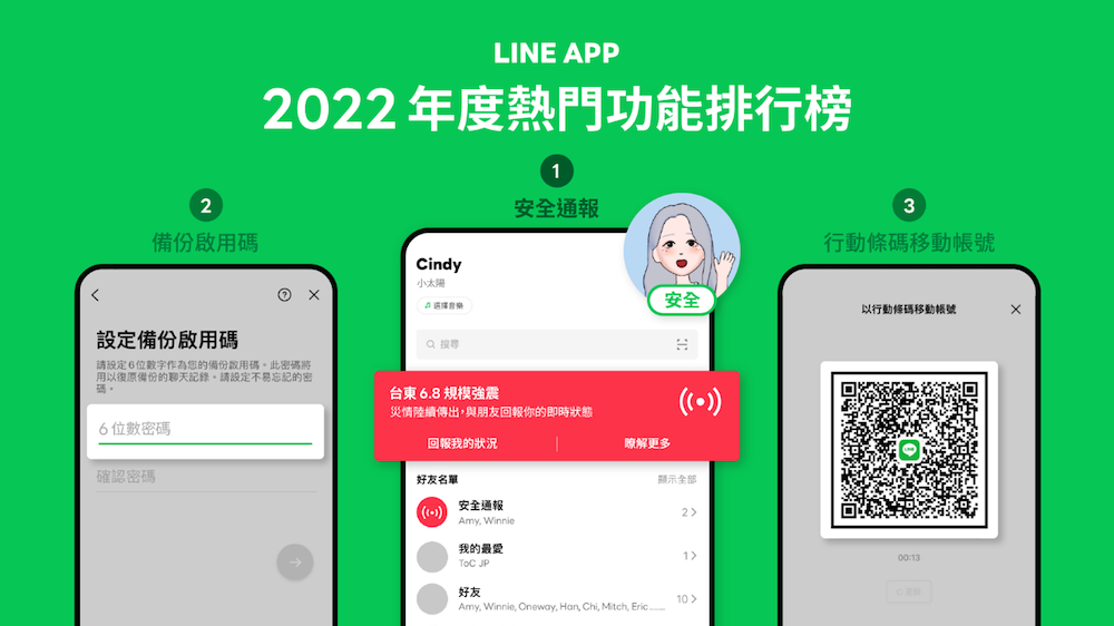LINE 安全通報提供便捷快速的狀態回報方式,不需打字,點選按鍵即可在緊急災難發生時,透過 LINE 立即回報自己的安全狀況,也能快速查看家人好友們目前回報的狀態,減少無法即時聯繫的焦慮。