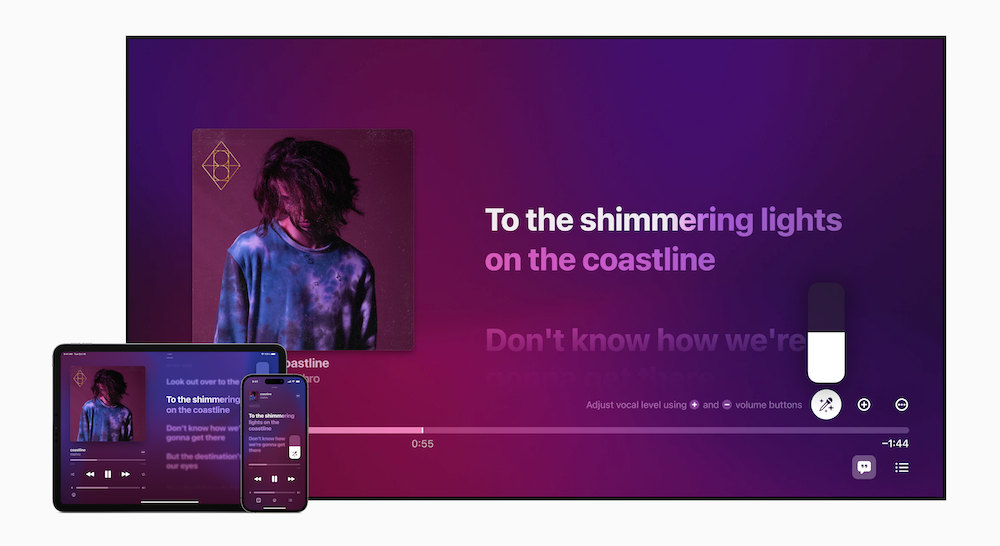 • 可調整的人聲:使用者現在可以控制歌曲的人聲音量。Apple Music 目錄的數百萬首歌曲中,使用者可以決定要跟著原唱的聲音一起唱、自己主唱,或是混合搭配自己與主唱的歌聲。