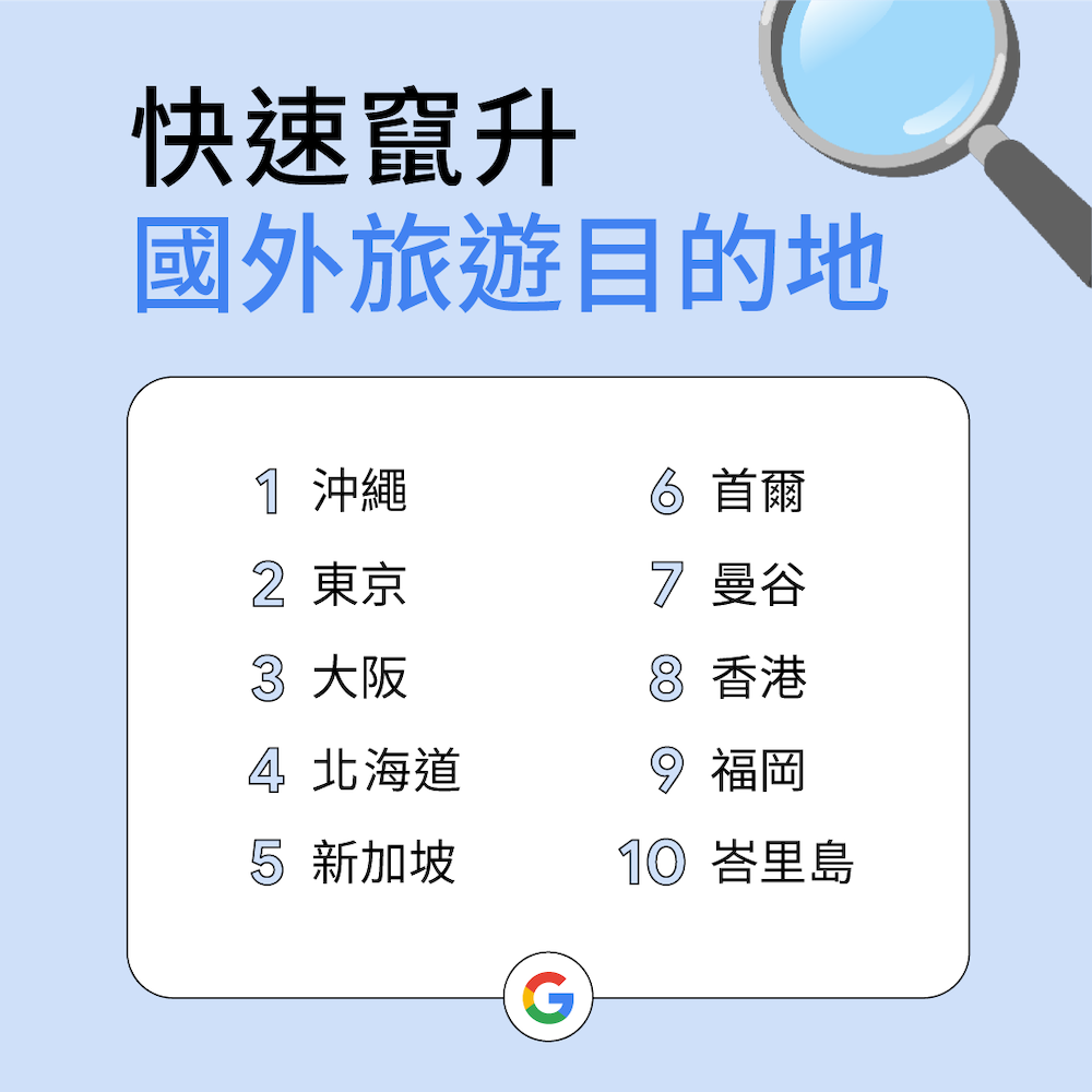 隨著各地疫情逐漸穩定,全球許多國家對於跨國境旅遊限制相繼開放,台灣也逐步放寬入境與邊境管制措施,等待多年的海外旅遊將可望實現。從今年的「快速竄升國外旅遊目的地」排行榜中,可觀察到日本成為台灣網友在疫情後出國旅遊的熱門選擇,其中「沖繩」、「東京」、「大阪」、「北海道」包辦了排行榜前四名,也是另一種台日友好的展現。此外,「曼谷」與「峇里島」兩個充滿南洋熱帶風情的度假景點,也紛紛上榜。從榜單也可觀察到,在後疫情時代跨國境旅遊逐漸恢復之際,台灣網友對短程飛行可抵達的鄰近地點,展現高度關注。