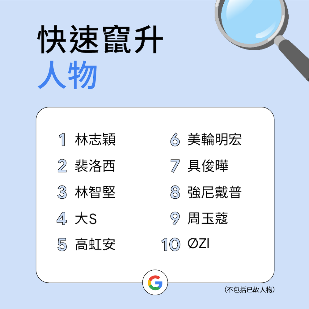 今年的快速竄升人物排行榜反映台灣網友對於影視娛樂的高度關注。藝人「林志穎」發生重大交通意外事件引發民眾關心並集氣給予祝福外,名人感情世界動向與周邊新聞也同時備受矚目,包含「大S」 、「具俊曄」與「強尼戴普」也紛紛上榜。年初率團訪問的美國眾議院院長「裴洛西」也引發廣泛討論,反映台灣網友對國際政經局勢與國際交流的高度關注。此外,適逢年底九合一選舉,也進而帶動相關政治人物搜尋熱度。特別的是,年初在網友間廣為流傳將手機或電腦桌布替換成日本資深藝人「美輪明宏」能帶來好運,也讓「美輪明宏」相關搜尋快速竄升,反映台灣網友不僅透過搜尋掌握名人動向外,更進一步為新奇問題尋找相關答案。