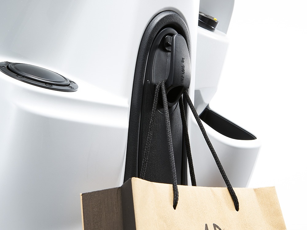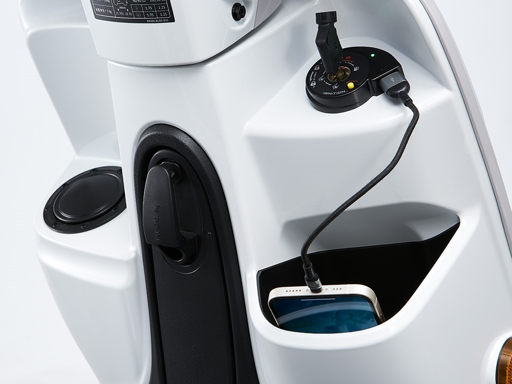 同時在復古速克達的外型設計下,龍頭下方的面板採大面積烤漆質感.改款後更加入前置物空間,方便騎士放置隨身物品,同時把5V2A的USB充電座從後車廂內改到與鎖頭整合,讓追求時尚的騎士也能兼顧實用性,手機充電更加方便。另外椅墊為自動彈起設定,讓手上拿滿東西時,也可以優雅的放置或拿取物品。