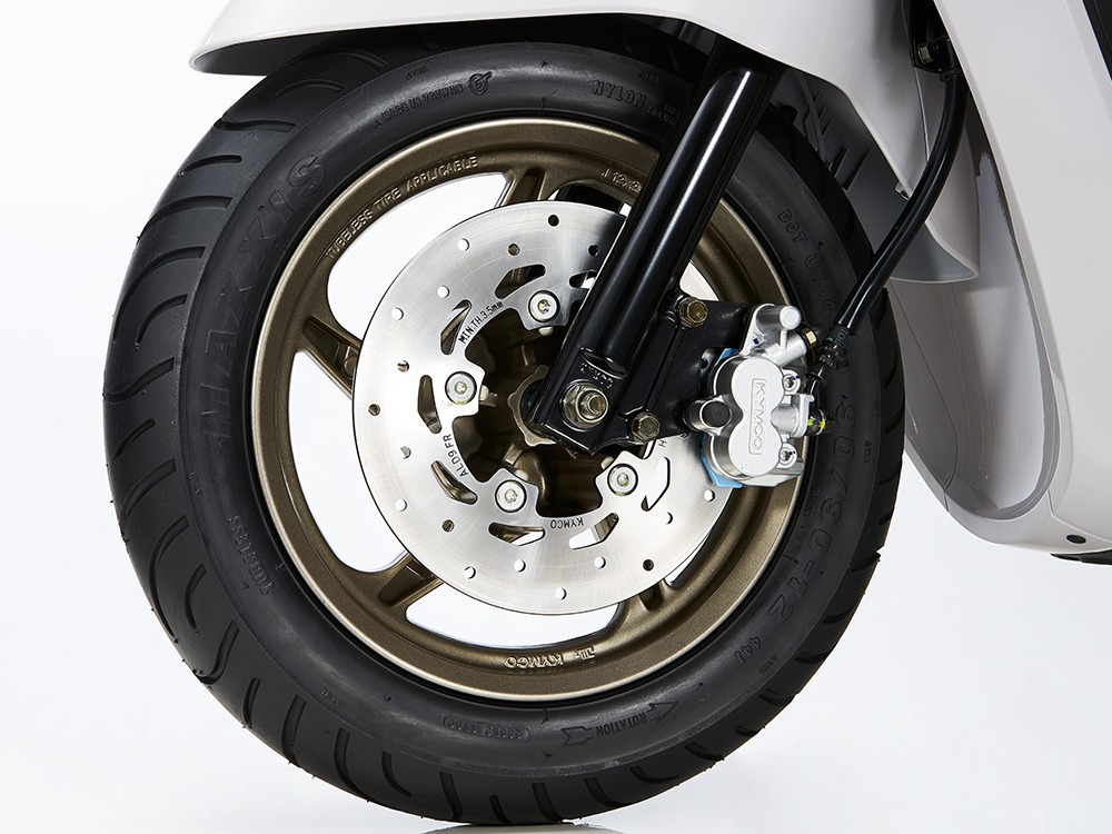並配置有德國 Continental 電子式 ABS 系統,當緊急煞車時,前輪煞車力道自動調節,無論晴雨天都可以讓車身保持穩定不打滑。同時前碟盤放大,煞車距離縮短,行車安全高度保障。
