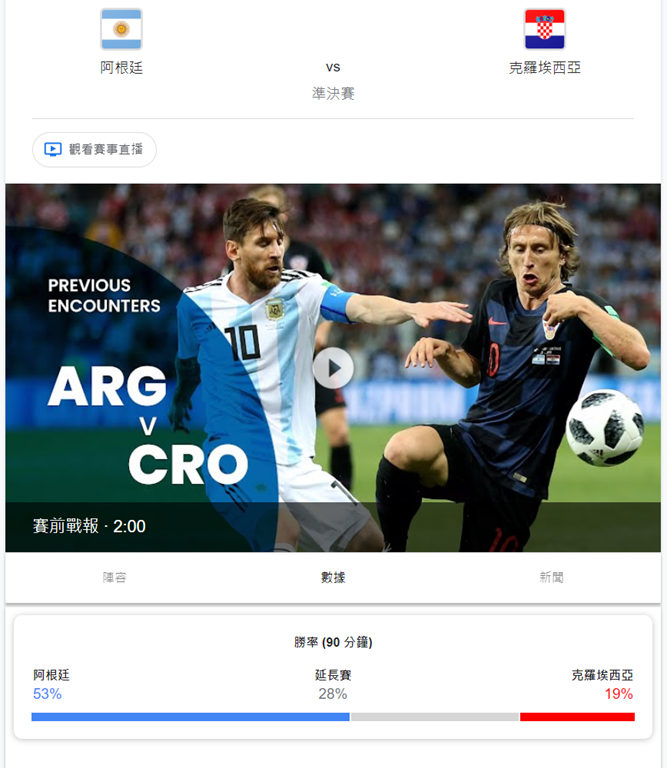 阿根廷與克羅埃西亞歷史上有過兩場對戰,分別都拿下過一勝,最近一場對戰是在 2018 年世界盃小組賽,克羅埃西亞以 3:0 拿下比賽。各方預料阿根廷有 53% 獲勝機會、克羅埃西亞則有 19% 勝率、進入延長賽機會有 28%。但勝率這件事情對於克羅埃西亞似乎完全沒有參考價值,畢竟這兩屆比賽克羅埃西亞都沒有被看好過。