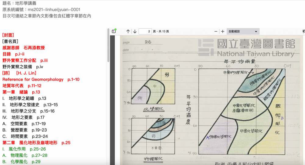 比如林惠娟女士是地圖專家,對於台灣地形、歷史有其貢獻,現任臺灣古地圖史料文物協會常務理事、中華民國地圖學會監事。在資料庫中就有收錄林女士在就讀國立臺灣師範大學地理系時,修習石再添教授課程的《地形學講義手抄本》。