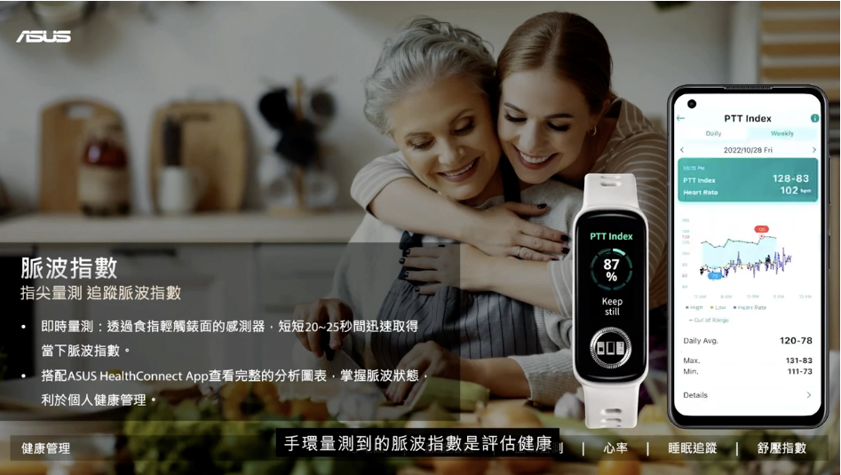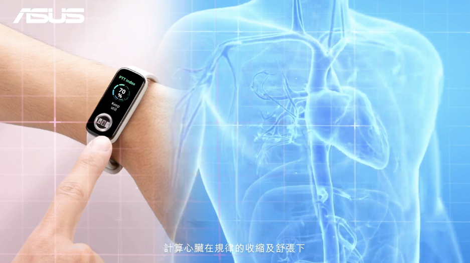 ASUS 表示 VivoWatch 5 AERO 是目前唯一一款可以量測脈波指數的智慧手環,採用醫規等級的三極片單導程 ECG 電學感測器和雙通道 PPG 光學感測器,可以直接讓用戶將手指放上錶面感測器位置後測量脈搏與血氧含量。