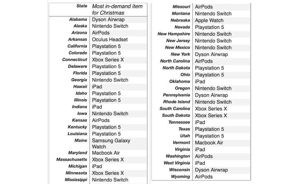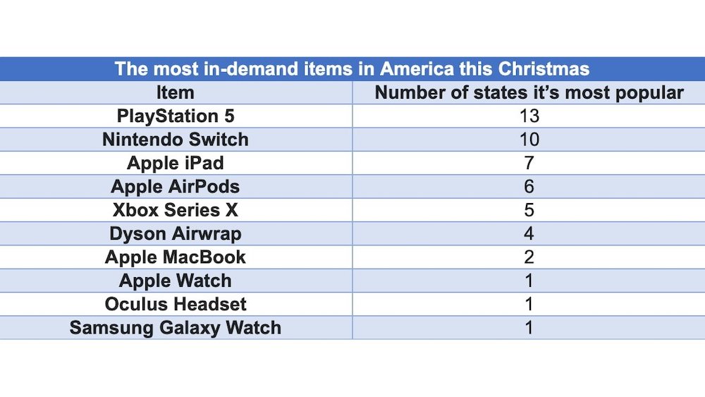 如果真的可以許願聖誕禮物,你最想收到什麼?根據外媒公布一項由樂天進行 Google Search 的抽樣調查發現,此次在美國大部分地區對聖誕節期間最需要的物品中,PlayStation 5 就佔了 13 個州的熱門搜尋,Nintendo Switch 則佔了 10 個州,以往大家最期待的 Apple 產品,今年則是由 iPad 的 7 個州為最熱門。