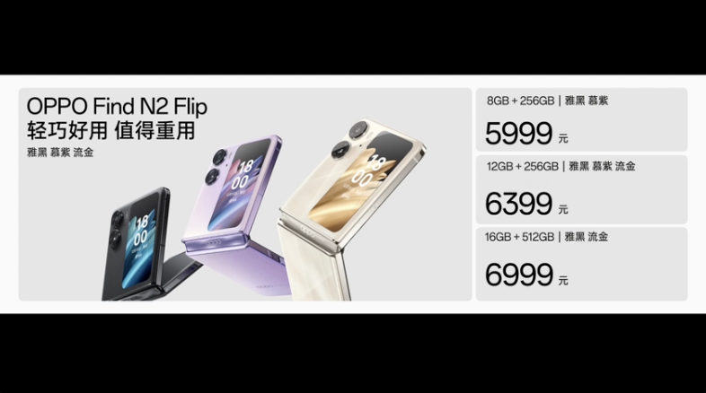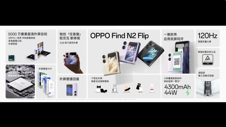 OPPO 掌上型摺疊機 Find N2 Flip 擁有 6.8 吋螢幕,同樣使用新一代鉸鏈,能夠支援 40 萬次折疊。