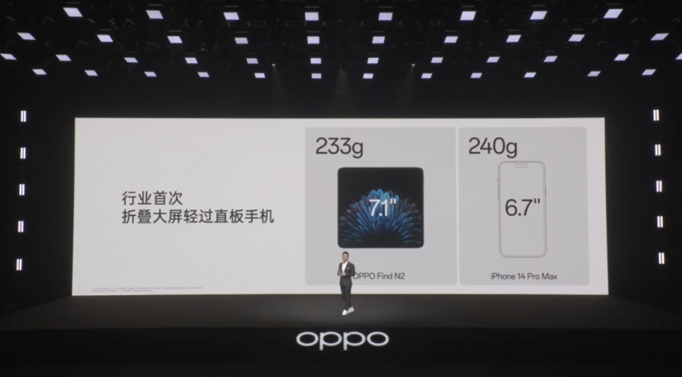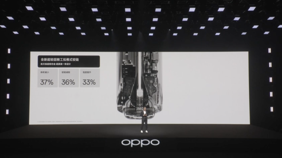 OPPO Find N2 採用超輕的新一代鉸鏈,折疊測試從上一代的 20 萬次提升到 40 萬次,並使用航空級複合碳纖維螢幕支撐結構與鈦合金螺絲釘,有著 233g 的超輕重量。
