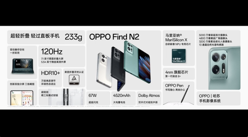 規格方面 Find N2 使用高通 Snapdragon 8+ 處理晶片、4520mAh 電池容量與 67W 超級閃充。