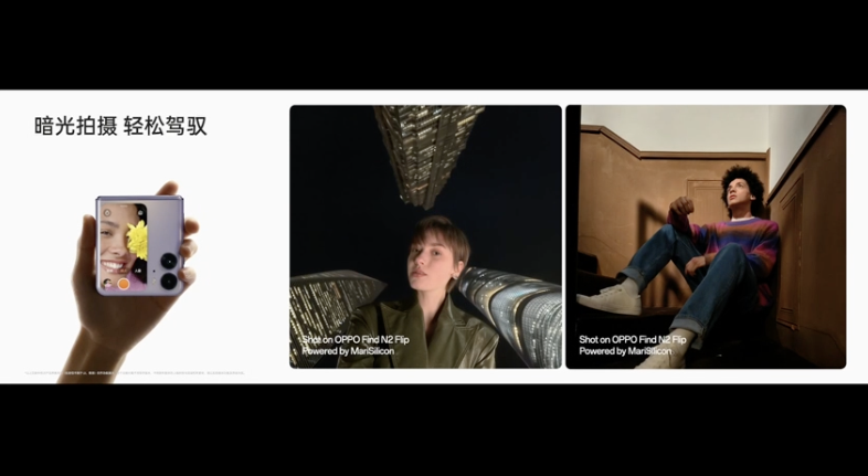 相機部分搭載了 5000 萬像素後置主鏡頭,支援高達 3 倍的順滑變焦,還有超清夜景演算法來輕鬆駕馭低光源環境的拍攝,3200 萬像素前置鏡頭則支援自動對焦。Find N2 Filp 也使用自家 MariSilicon X 影像晶片,並搭配哈蘇影像系統,要帶給用戶更滿意的拍照體驗。