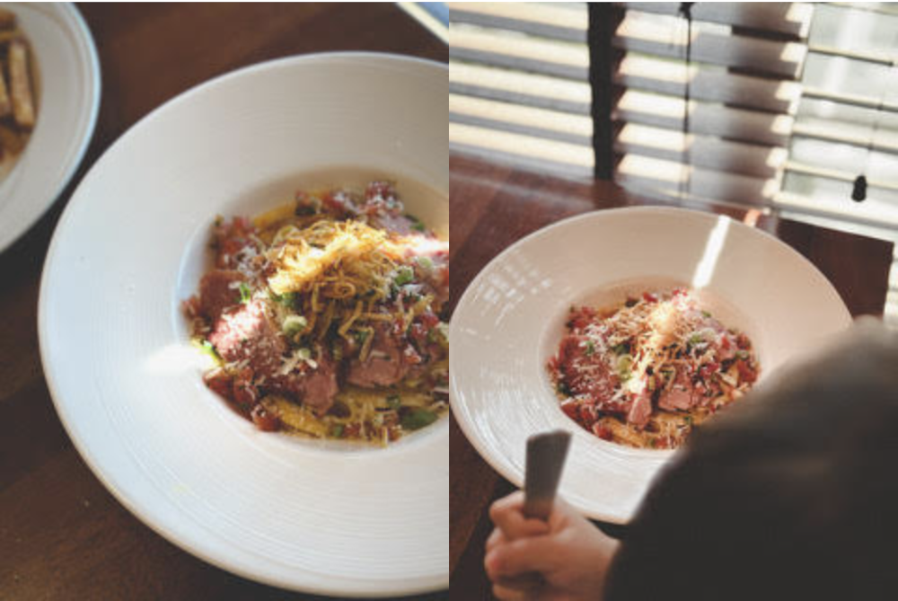 建議拍攝食物使用 2 倍變焦提供的 48mm 焦距變焦效果,他表示「即便沒有生命的物體都會顯得有深度,讓照片有故事力。」他分享關於拍攝食物小技巧,如果座位靠窗,可運用窗景和窗光的形狀變化,讓畫面亮暗部更豐富、營造流動感;不想要單調的拍菜色,則能透過餐桌擺設或其他人的手和肩當前景,把菜色放在九宮格線的正中間,有了前景不但不會有置中的呆板感,反而拉出層次。