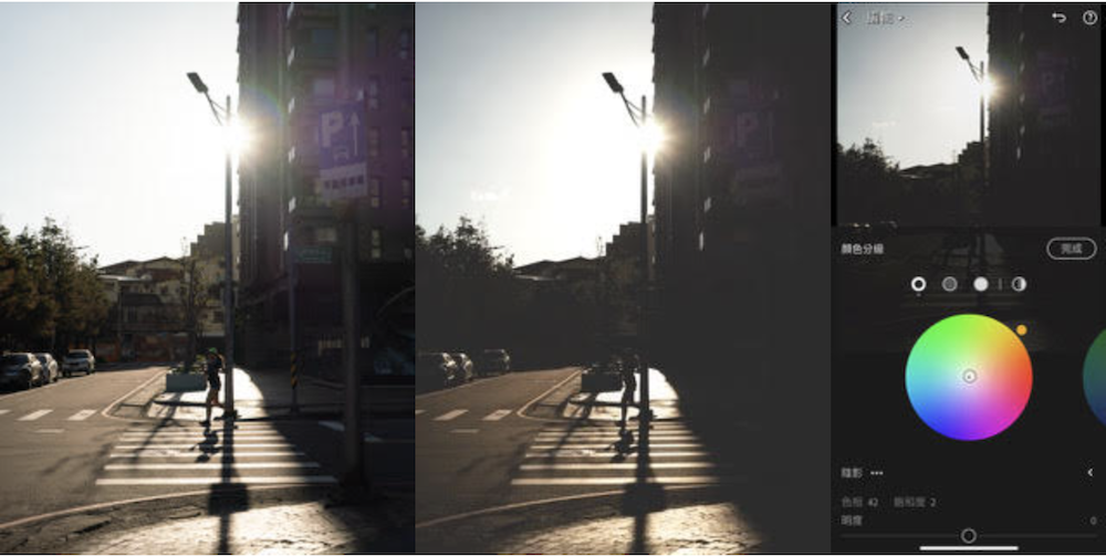 面對遠景的逆光畫面,薛越使用 iPhone 內建相機,將焦點置於畫面中亮與暗處的交界拍攝,再透過 Lightroom 內的光線針對局部微調,以「白平衡」決定照片調性要柔和還是帶有個性。甚至能用「顏色」改變色溫,清晨拍攝畫面也能有黃昏情景的多種不同氛圍呈現。
