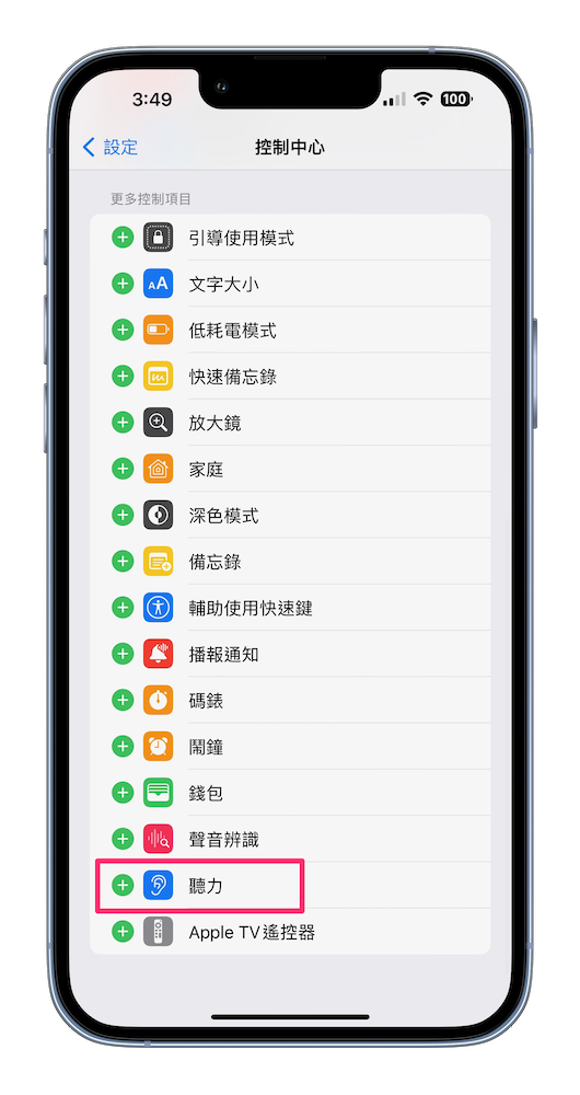 步驟 1. 先在 iPhone 中的「設定」>>>「控制中心」中將「聽力」加入。