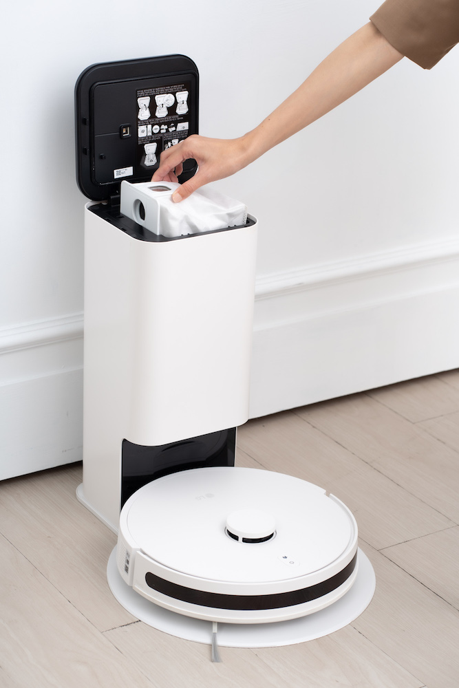 LG R5T 濕拖清潔機器人配備自動除塵座,強力吸塵馬達可自動清除集塵盒中的灰塵,並以 UVC 紫外線照射,減少集塵袋內細菌生長,有效防止細菌揚塵等異味孳生,免去傾倒垃圾的煩惱,髒污無須沾手,打掃善後超輕鬆!
