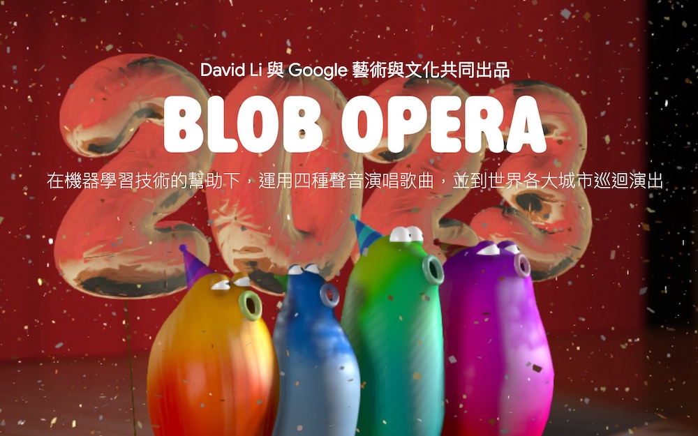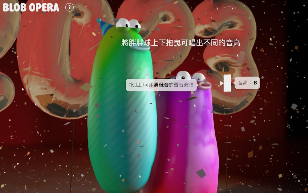 Google 說明歌劇演唱家是以優美的人聲做為樂器來表達情感,而這項實驗的目的是要向人聲這種人人都能學會的樂器致敬。我們可以即時運用「BLOB OPERA」中分別代表男低音、男高音、次女高音、女高音的 4 個胖胖球的 4 種歌劇人聲來演唱歌曲,而且我們自身並不需要具備任何歌唱技巧。