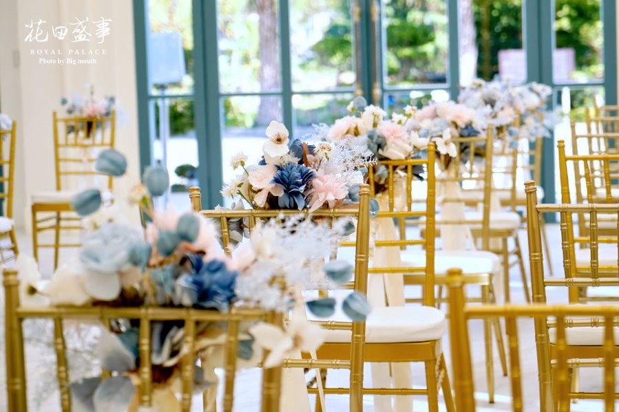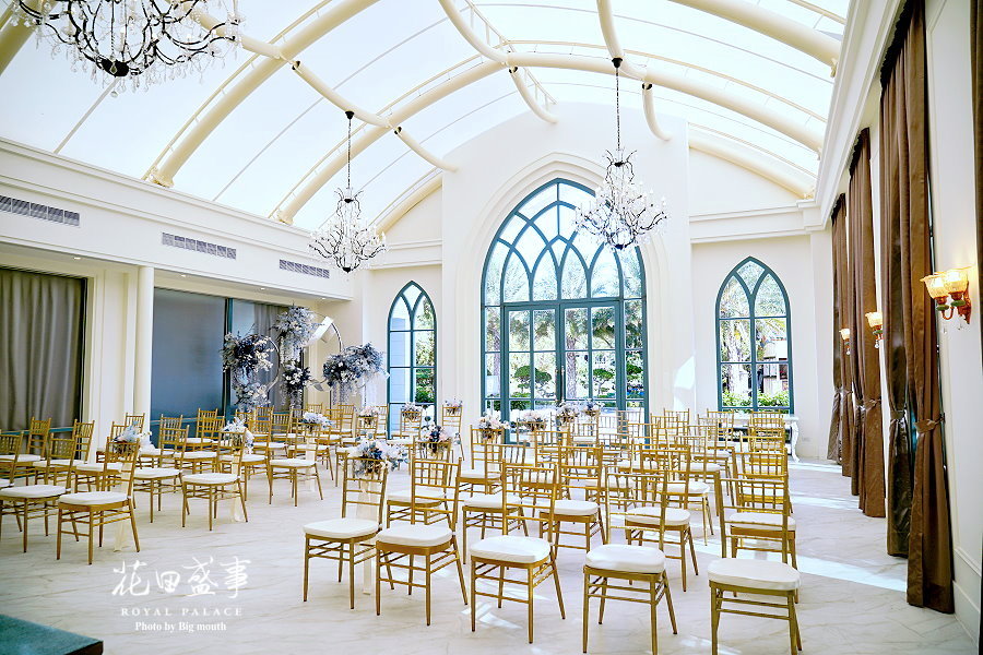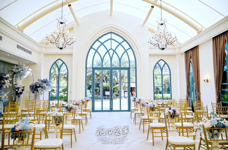 ▼華麗水晶吊燈搭配金色座椅,加上各式花飾妝點,華麗典雅又帶點浪漫氣息~