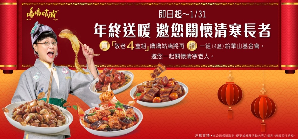 每到歲末寒冬,春節即將來臨,家家戶戶團圓的日子,卻有許多獨居弱勢的長輩一個人冷清過節。嚕嚕姑滷以美味料理溫暖人心,響應「華山基金會第 33 屆寒士吃飽 30 活動」,即日起至 1/31,在哪味電商 (FOODINNOVA) 下單嚕嚕姑滷敬老組 (4 盒入),品牌將再捐出一組予「華山基金會第 33 屆寒士吃飽 30 活動」,希望讓大家吃到暖心美味的同時,又可以分享美味關懷清寒長者們。藝人海裕芬也在其社群發起,呼籲藝人朋友們一同在社群平台響應,期許能在歲末年終之際,可以讓更多朋友們注意到孤老長輩們,一起分享愛心,讓長輩們也可以過一個溫暖的春節。