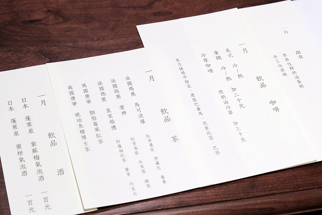 每月菜單不定,附上一月份的菜單給大家參考~目前餐點是以一份甜點盤搭配一杯飲料。
